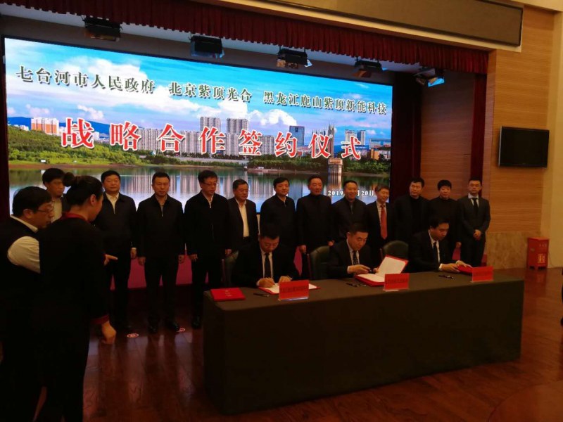 2019年1月20日上午,七臺(tái)河市人民政府、北京紫頂光合企業(yè)管理中心(有限合伙)、黑龍江鹿山紫頂新能科技有限公司簽約儀式在市專家接待中心舉行。市委書記楊廷雙,市委副書記、市長賈君,市委常委、秘書長蔣和慶,市政府副市長王義光,市政府秘書長陳志、鹿山集團(tuán)鐘金海等領(lǐng)導(dǎo)出席簽約儀式。市委常委、副市長安虎賁主持簽約儀式。